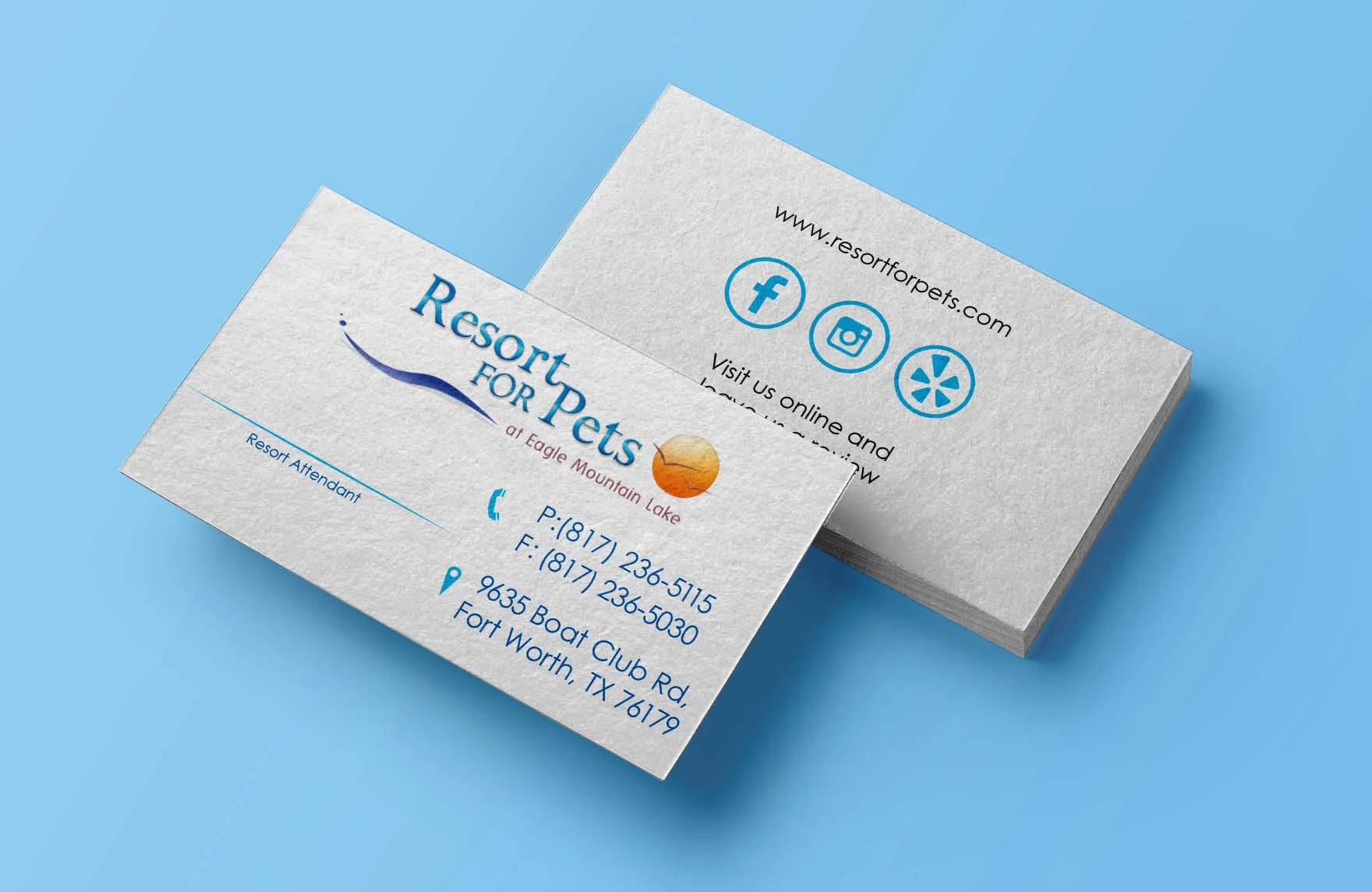 Business cards for the employees of the wonderful Resort for Pets at Eagle Mountain Lake in Fort Worth, Texas.